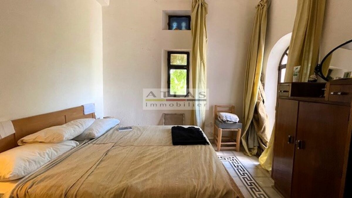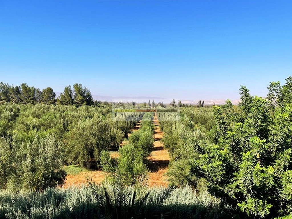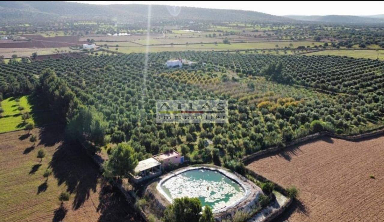 The property spans 9.3 hectares, fully titled and equipped with all necessary permits, with no VNA. It is set up for fruit tree cultivation with an olive grove of 3,200 olive trees spread over 8 hectares, including Picholine Maroc and Arbequine varieties, as well as 130 pomegranate trees. The drip irrigation system, powered by 2 wells and a reservoir, ensures efficient water management.