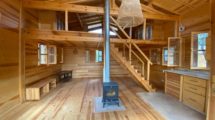 Cast iron wood stove with its fireplace in the center of the chalet.