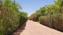 Grassed garden planted with palm trees, olive trees and other subjects.