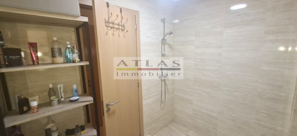 This South/East facing apartment, in a secure residence with 24/24 guards, with an area of 95 m² of living space is composed of a living room – dining room giving access to a spacious terrace, a closed kitchen equipped with fridge – hood – gas burners – electric oven and washing machine, a master suite with storage and shower room, two bedrooms with cupboards sharing a second shower room with toilet.