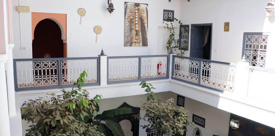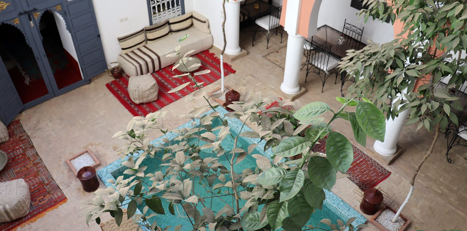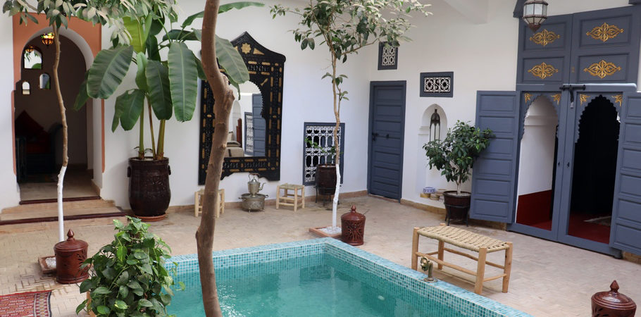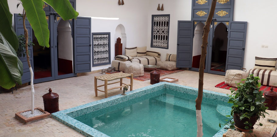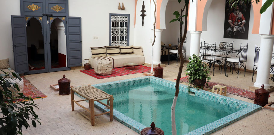 This Riad located in the medina, 200 meters from a guarded car park, is in excellent condition and has undergone a renovation this summer. Every detail has been thought of to make life and stay comfortable. Its vast patio of 60 m² and its basin give it a crazy charm. Very bright, it has five bedrooms and a beautiful terrace. Currently intended for residential use, it is however classified guest house and classified 9.2 on Booking.