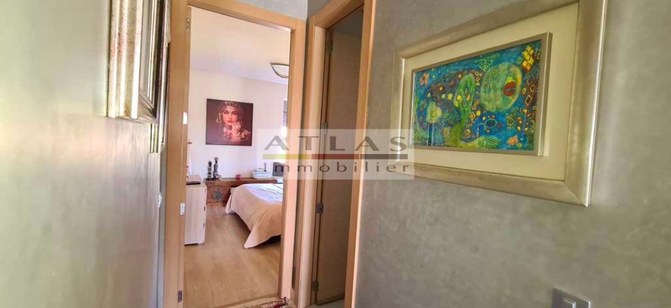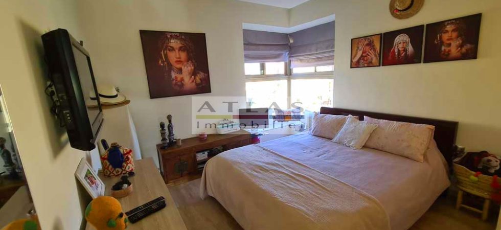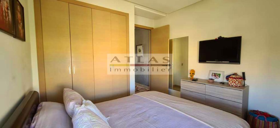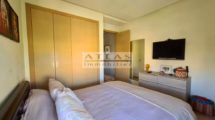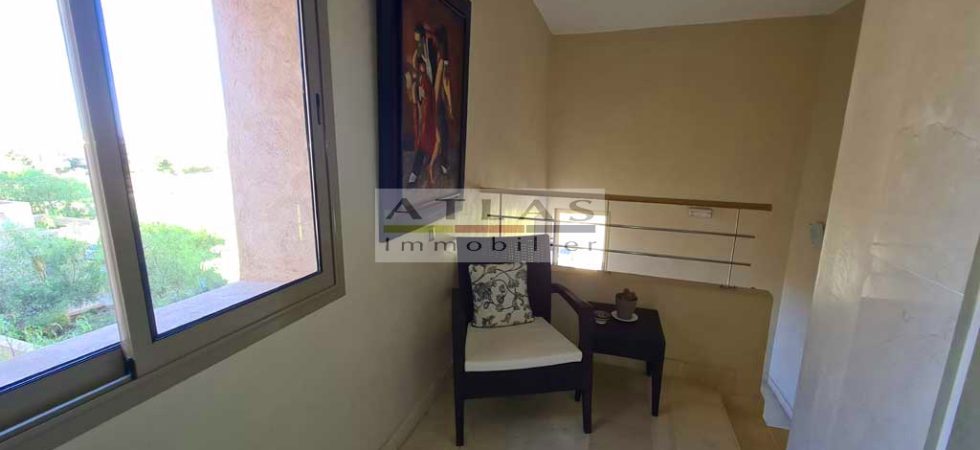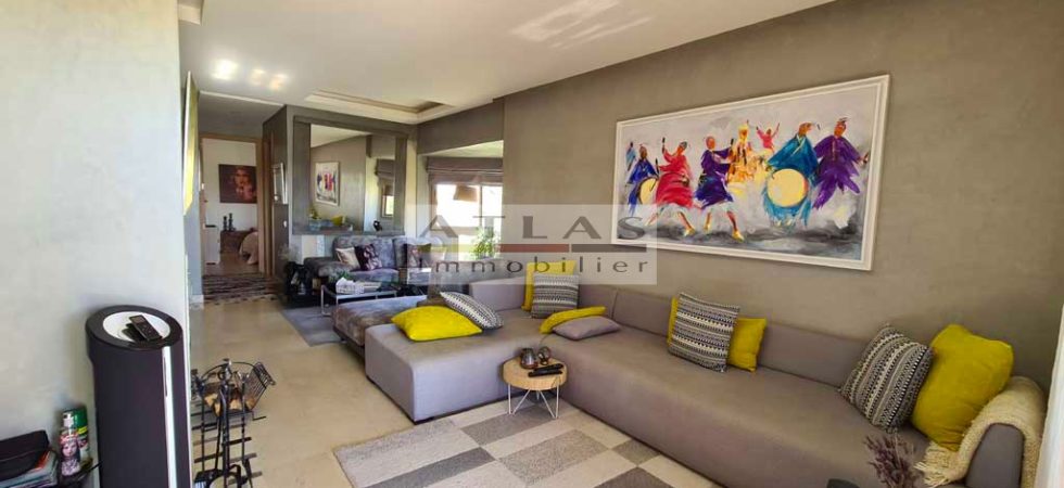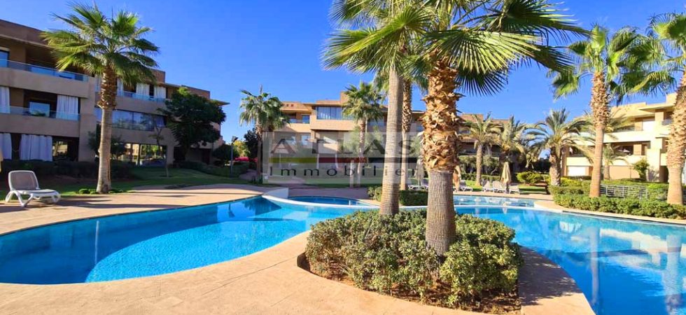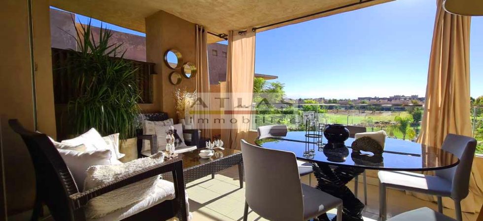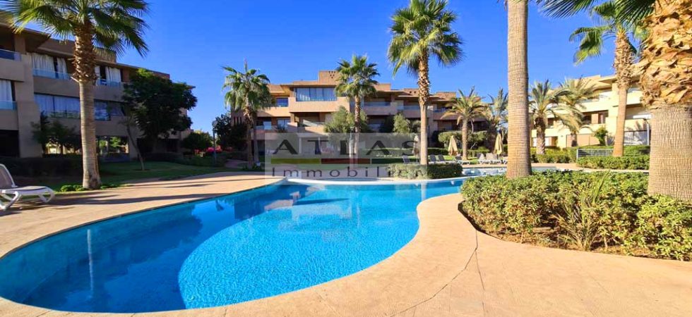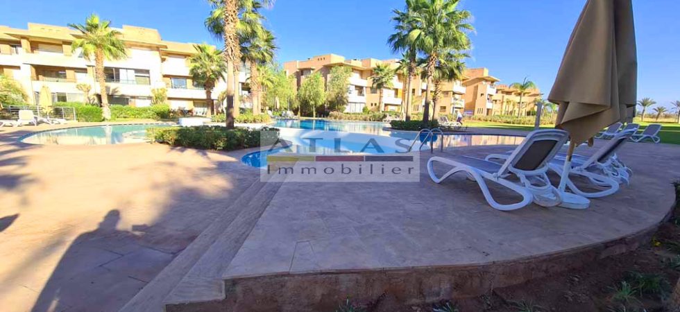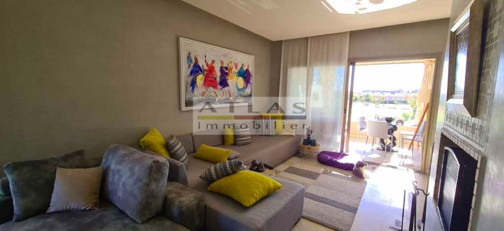 Long-term rental of 12 months, splendid and magnificent T3 rented furnished, facing south, with a breathtaking view of the swimming pool and the Atlas mountains. Amber yellow color from Naples, the Prestigia estate exudes authenticity. This apartment, just 7 minutes from the center of Marrakech, in a secure residence with two swimming pools, guard 24/24, with an area of 108 M² with terrace, is composed of spacious living rooms. Enjoy a fireplace in your living room for the cooler nights and for the hottest summers, centralized air conditioning. A living-dining room, two toilets, a suite with its bathroom, a second very bright bedroom, a shower room, a very well equipped kitchen with a laundry room, containing fridge, extractor , gas hob and electric oven, dishwasher, washing machine, and a second large refrigerator, you will also benefit from the area to relax during a short walk on the golf course with the exceptional view.