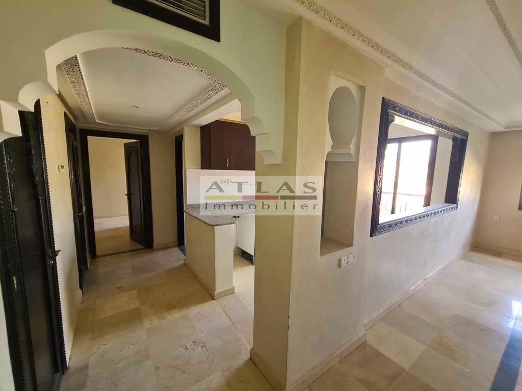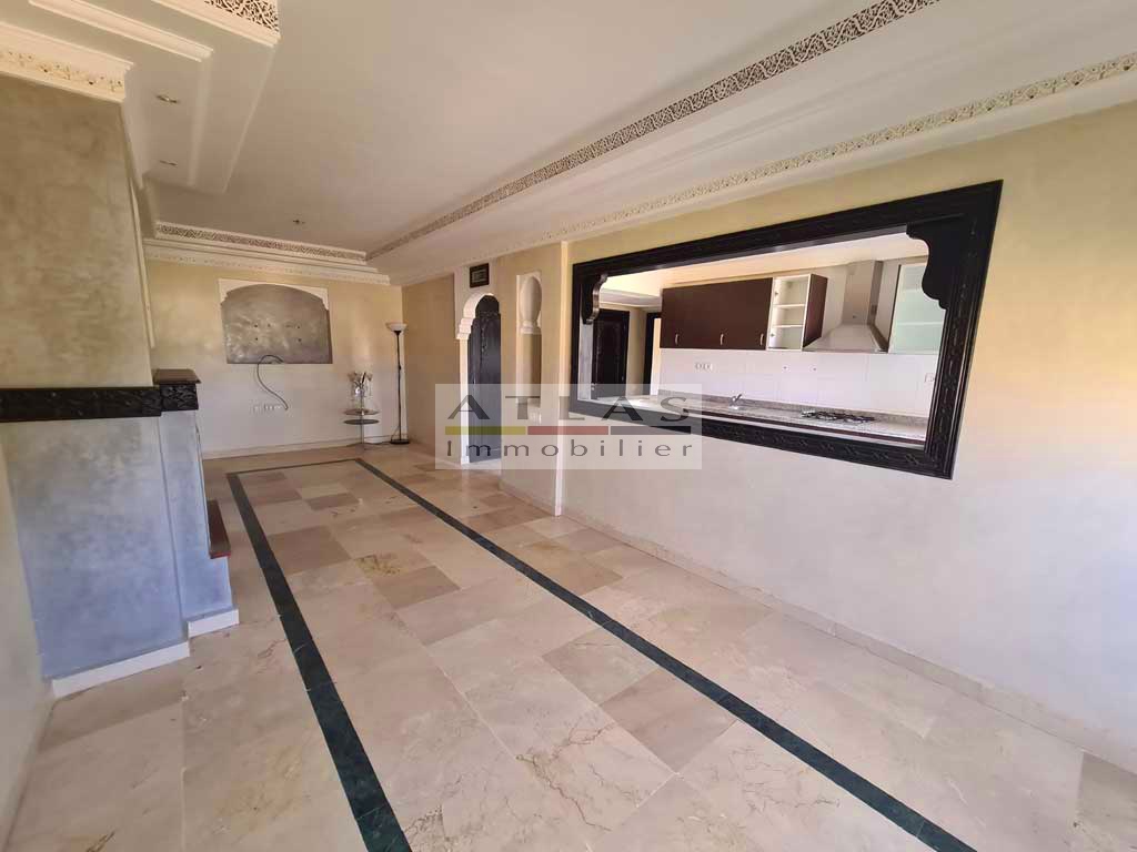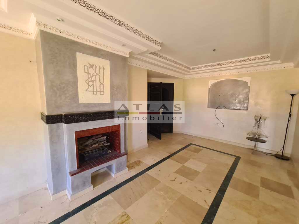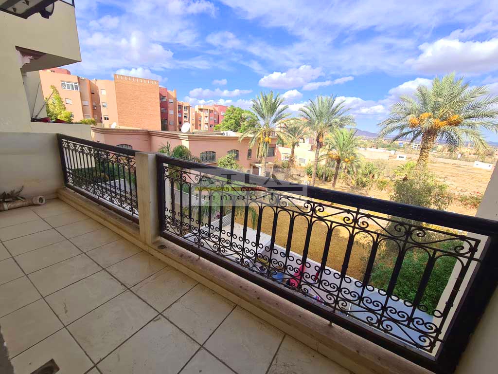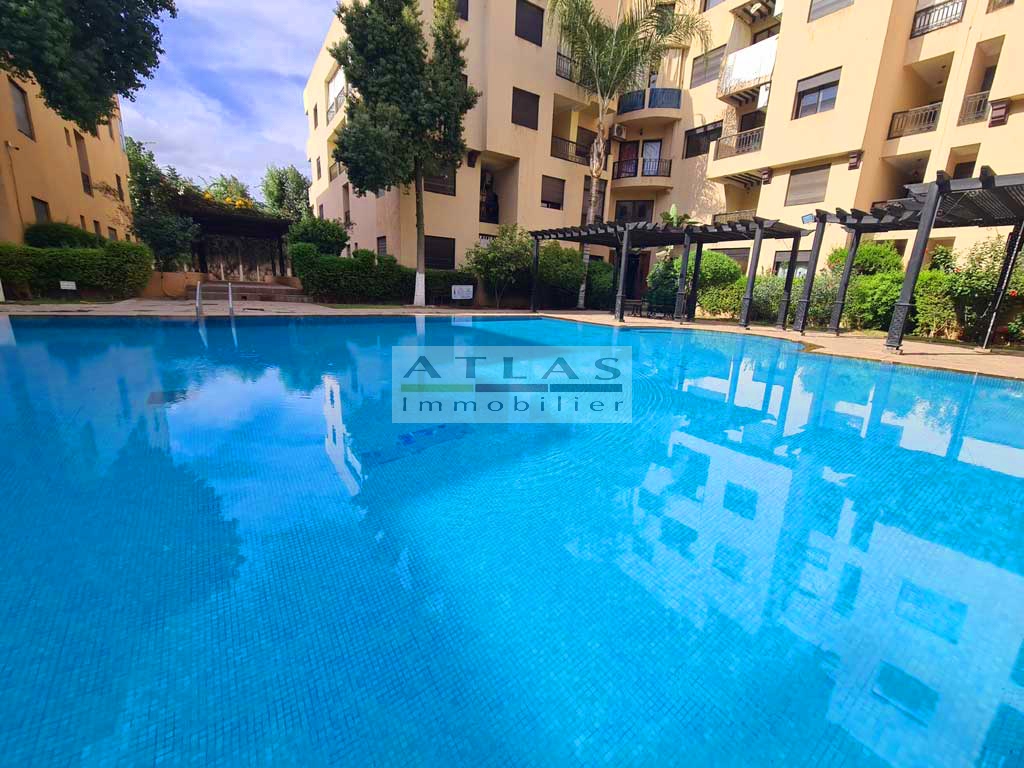 Located just 10 minutes from the center of Marrakech, in this secure 24/24 – 7/7 residence, this apartment on the 1st floor of a residence with swimming pool, with an area of 80 m², is priced at 10,750 dirhams per m². It includes a spacious, very bright living-dining room with fireplace, an open fitted kitchen with a balcony, a shower room, a guest toilet, two bright bedrooms. The apartment is equipped with centralized air conditioning and also has an outdoor parking space.