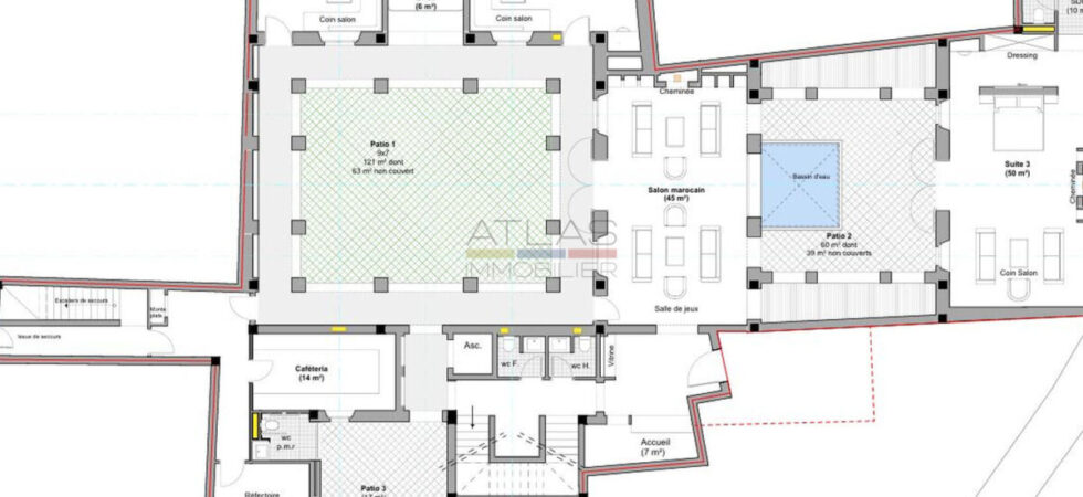 De nombreux espaces de vie et de services complètent l’ensemble : salons de réception, salle de jeux, salon marocain, réfectoire, cafétéria, lingerie, vestiaires, boutique, ascenseur…