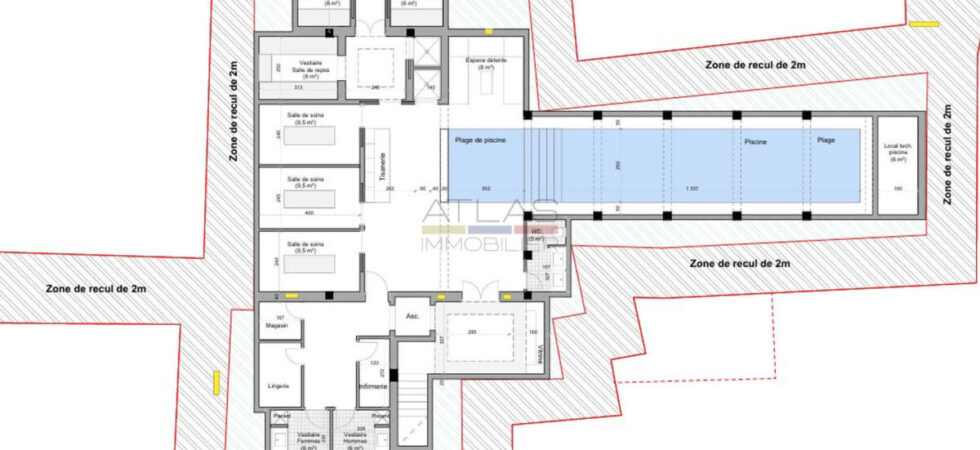La superficie habitable totale estimée à terme est d’environ 900 m², hors terrasse, dont près de 400 m² d’espaces communs (accueil, salons, restaurant, bien-être, services…).