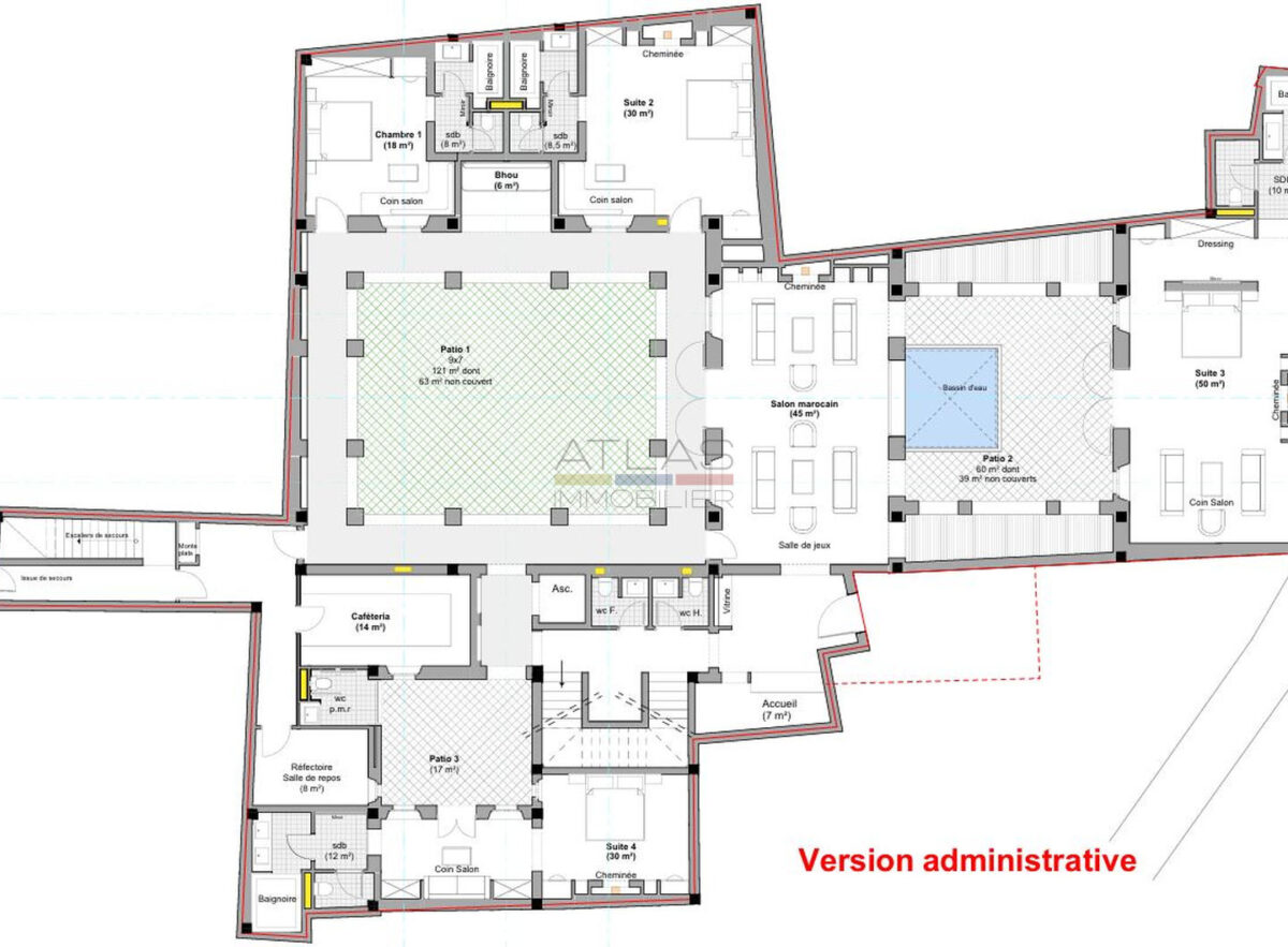 Ce terrain bénéficie d’un permis de construire délivré en 2024, autorisant la création d’un établissement de première catégorie : un riad de prestige articulé autour de trois patios de 120 m², 60 m² et 17 m².