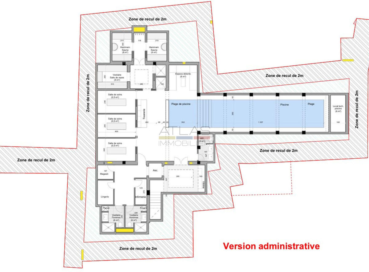 La superficie habitable totale estimée à terme est d’environ 900 m², hors terrasse, dont près de 400 m² d’espaces communs (accueil, salons, restaurant, bien-être, services…).