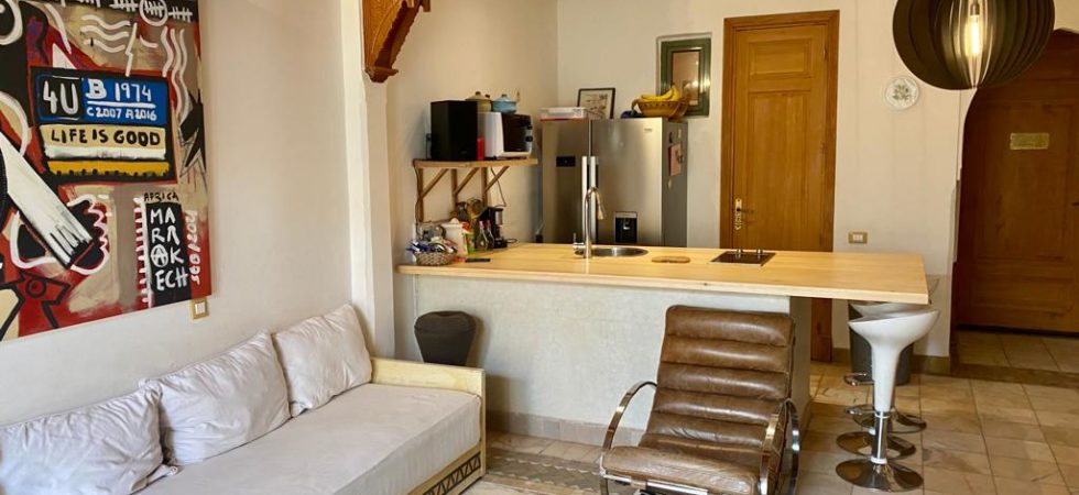 Petit pied à terre au sein d’une résidence luxuriante, idéalement situé dans le circuit de la Palmeraie à dix minutes à peine du centre ville.