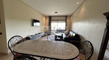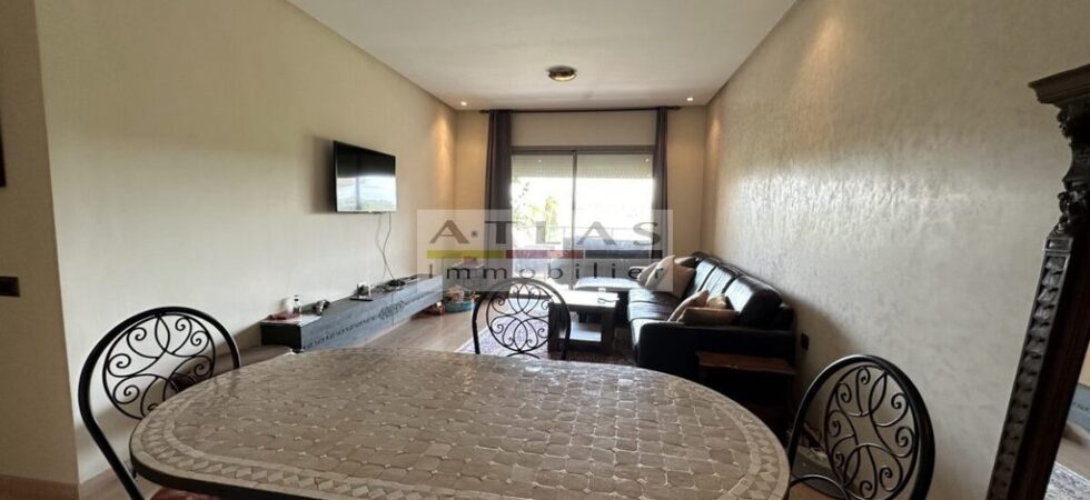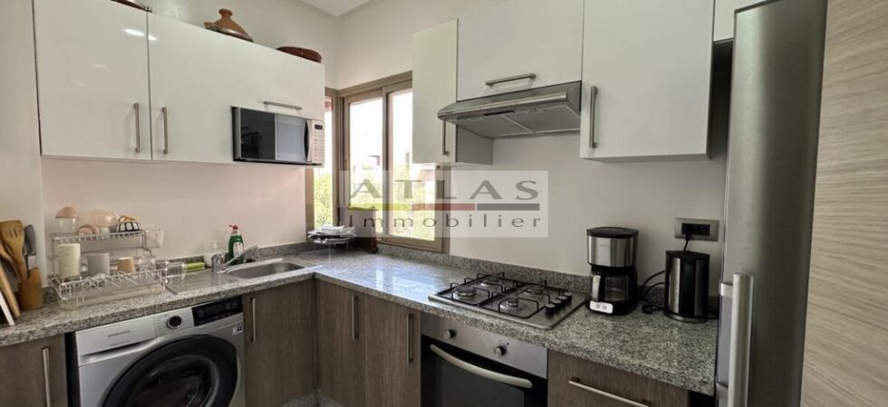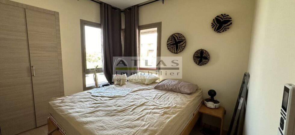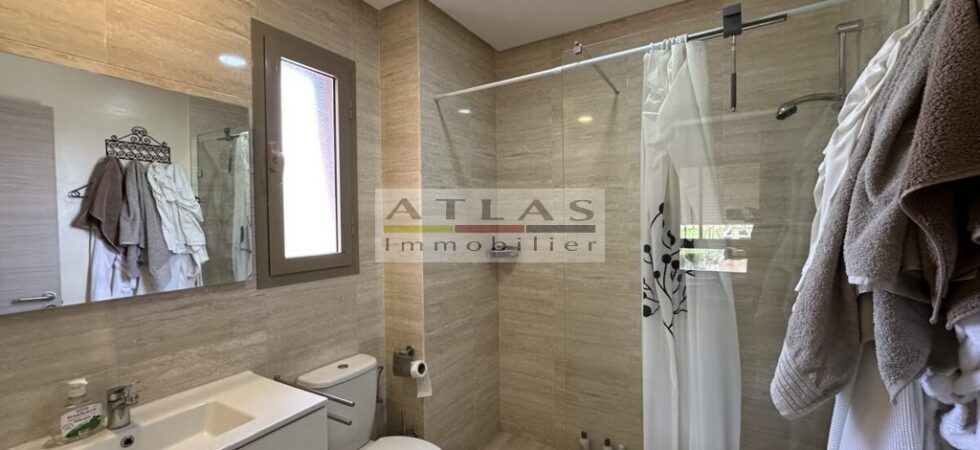 La pièce à vivre lumineuse s’ouvre sur une vaste terrasse offrant une vue imprenable sur le golf et la piscine, créant ainsi un espace idéal pour se détendre ou recevoir des invités. Cet appartement est parfait pour un pied-à-terre à Marrakech ou pour un investissement locatif prometteur.