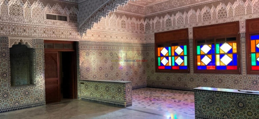 Le rez-de-chaussée accueille une grande salle des fêtes, un espace fitness, un vaste salon lumineux, ainsi qu’une partie habitation comprenant quatre chambres confortables et deux salles de bains. Un magnifique patio arboré, équipé d’un toit électrique, dessert une suite privative, un bureau, une chambre pour le personnel et une chambre froide. Un hammam beldi authentique, un hall d’entrée accueillant et un garage fermé complètent cet espace de vie unique.