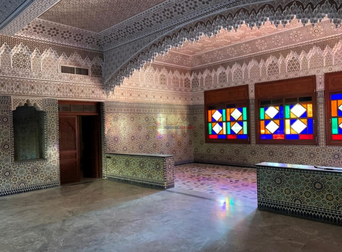 Le rez-de-chaussée accueille une grande salle des fêtes, un espace fitness, un vaste salon lumineux, ainsi qu’une partie habitation comprenant quatre chambres confortables et deux salles de bains. Un magnifique patio arboré, équipé d’un toit électrique, dessert une suite privative, un bureau, une chambre pour le personnel et une chambre froide. Un hammam beldi authentique, un hall d’entrée accueillant et un garage fermé complètent cet espace de vie unique.