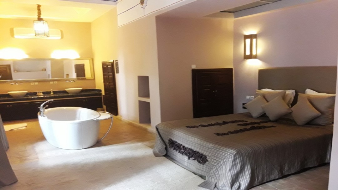 Il s’agit d’un Riad de charme alliant un somptueux mélange d’architecture marocaine et de décoration contemporaine.  Il dispose de cinq suites spacieuses au décor raffiné dont deux d’entre-elles sont en duplex pouvant accueillir familles ou groupes d’amis (quatre à cinq personnes).  Autre atout de ce Riad, une douiria attenante lui offre un espace privé dédié au personnel, au bureau, à la cuisine.  Cette douiria possède elle aussi deux chambres.