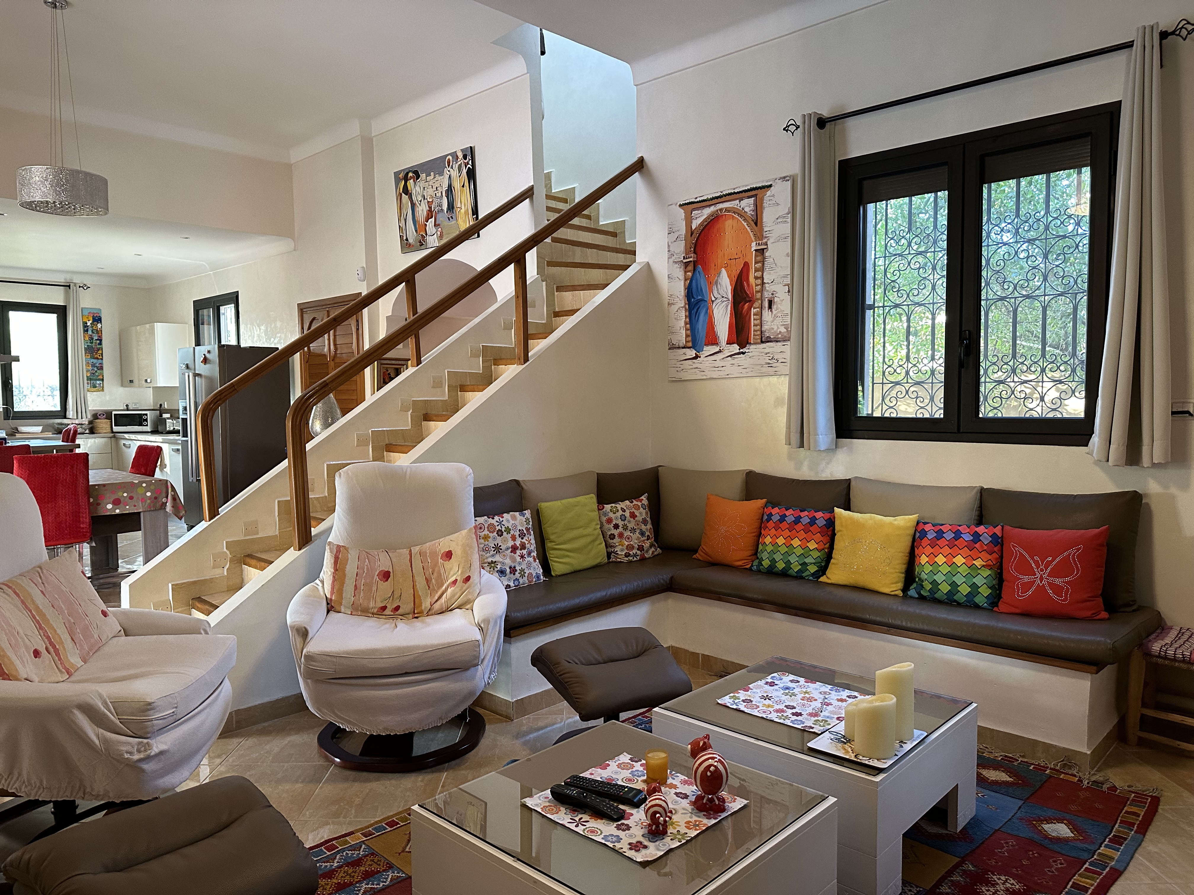 - Un salon spacieux offrant une vue imprenable sur le jardin et la piscine.