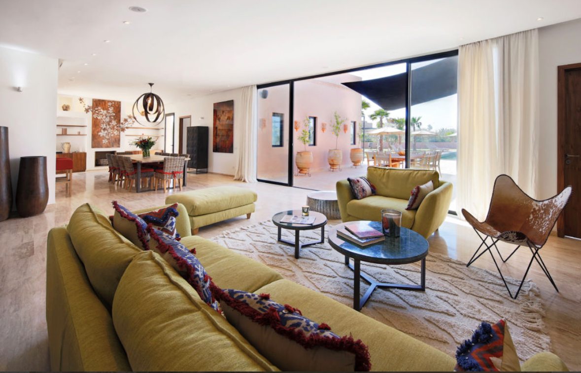 Dans un domaine situé dans le prolongement de la Palmeraie, route de Fes, composé de seulement dix-neuf villas et offrant un environnement magnifique entre l’Atlas et les Jbilets à vingt minutes du centre de Marrakech.