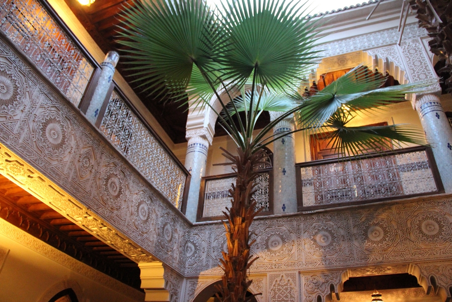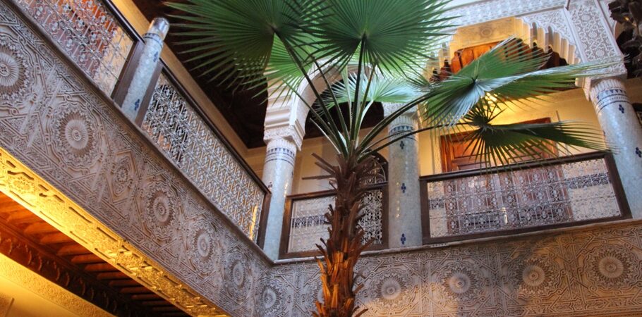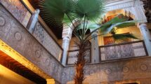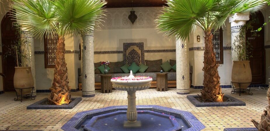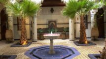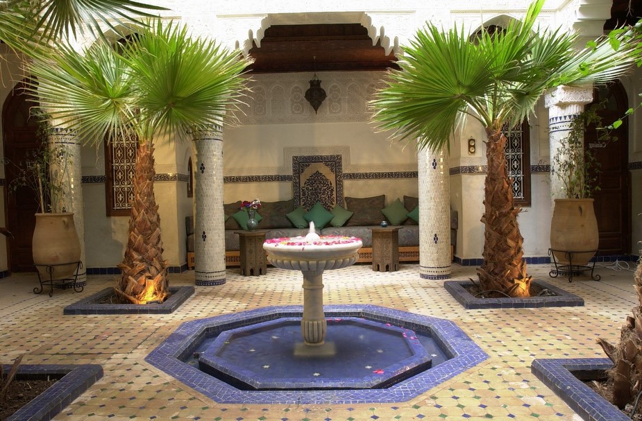 • Patio orné d’une fontaine, bhou, palmiers,