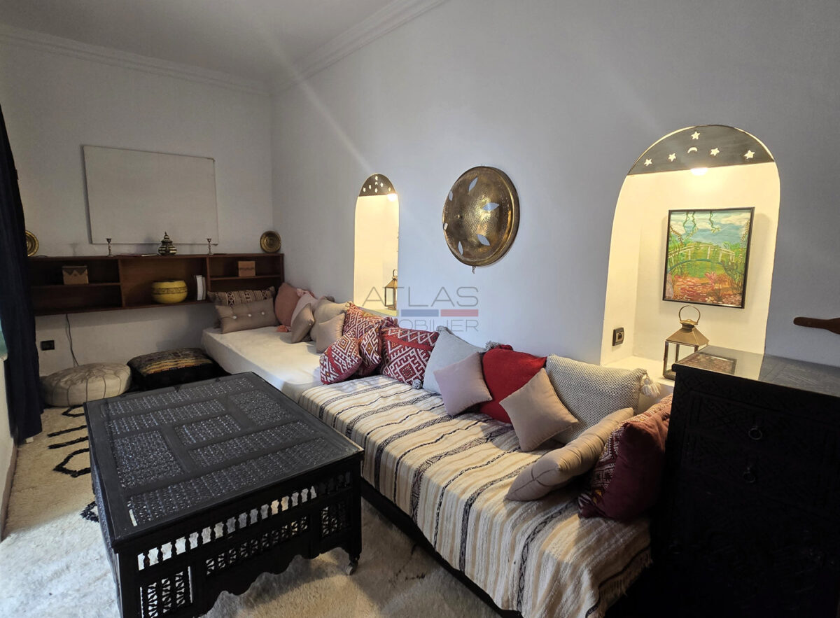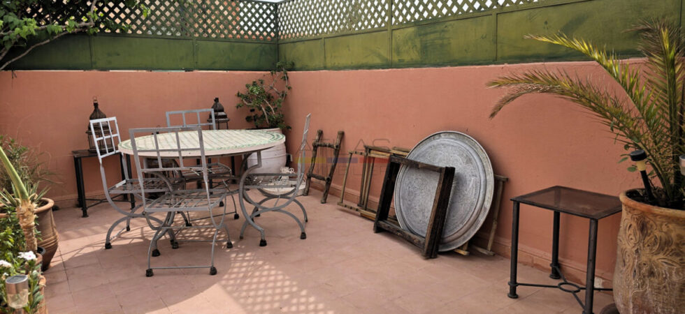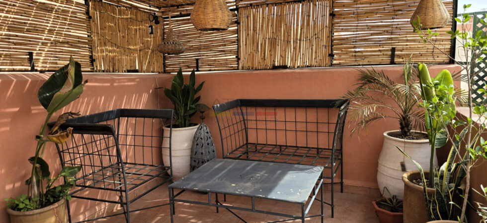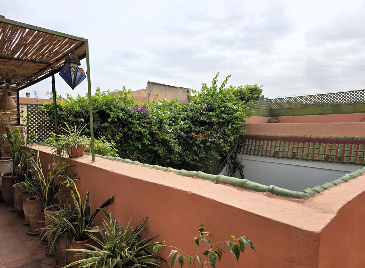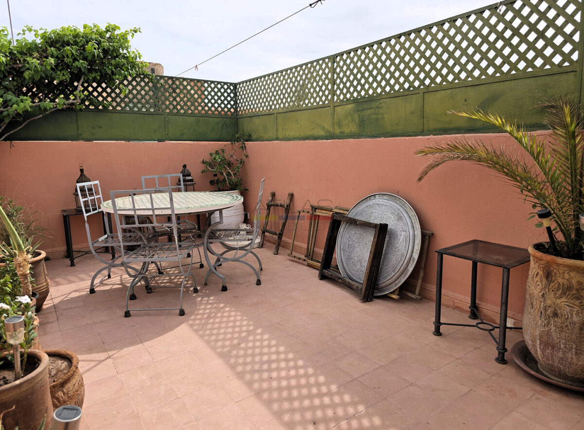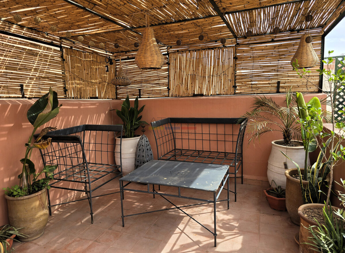 La terrasse, accessible par l’escalier intérieur, propose un agréable coin abrité idéal pour les repas en plein air, ainsi qu’un espace « solarium » invitant à la détente. L’ensemble forme un lieu de vie paisible, baigné de lumière, parfait pour une résidence principale, secondaire ou un investissement locatif dans l’un des secteurs les plus recherchés de Marrakech.