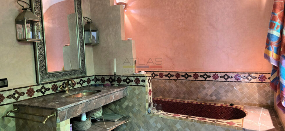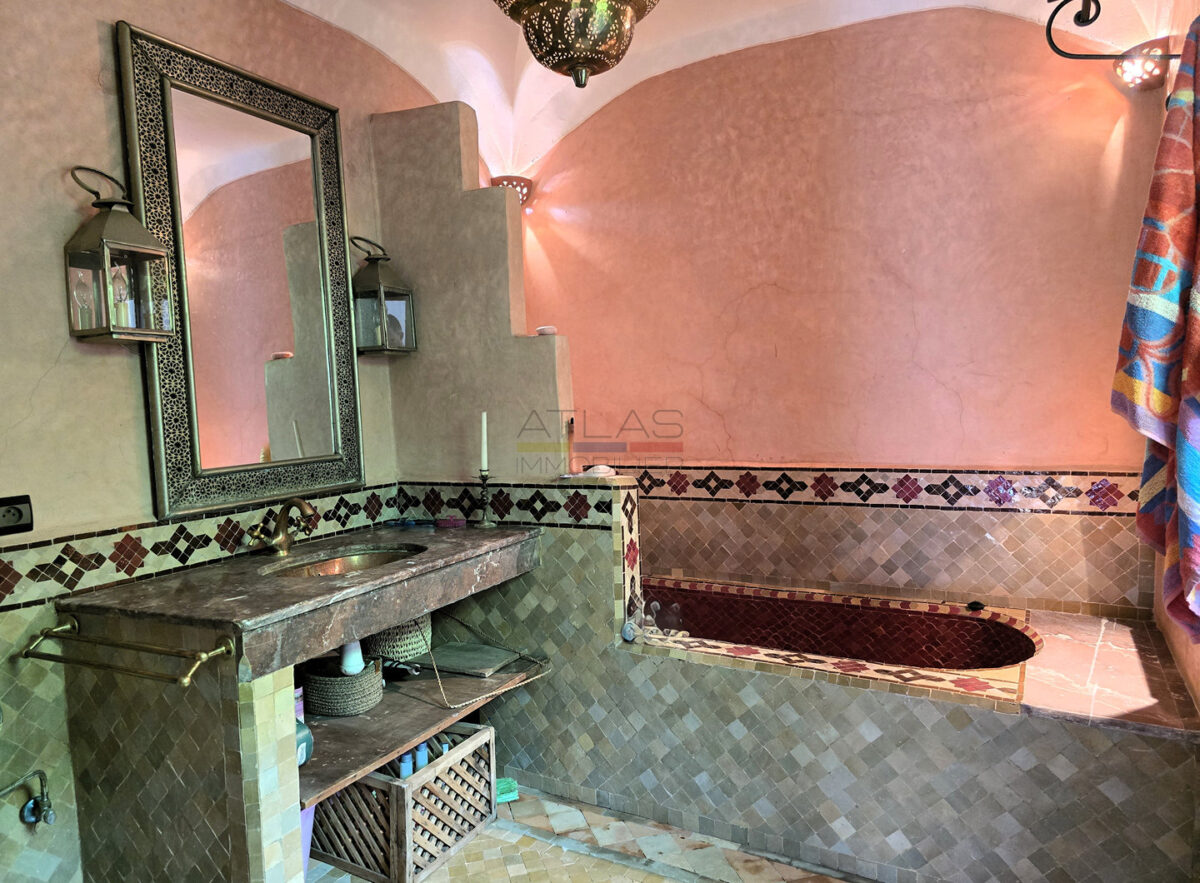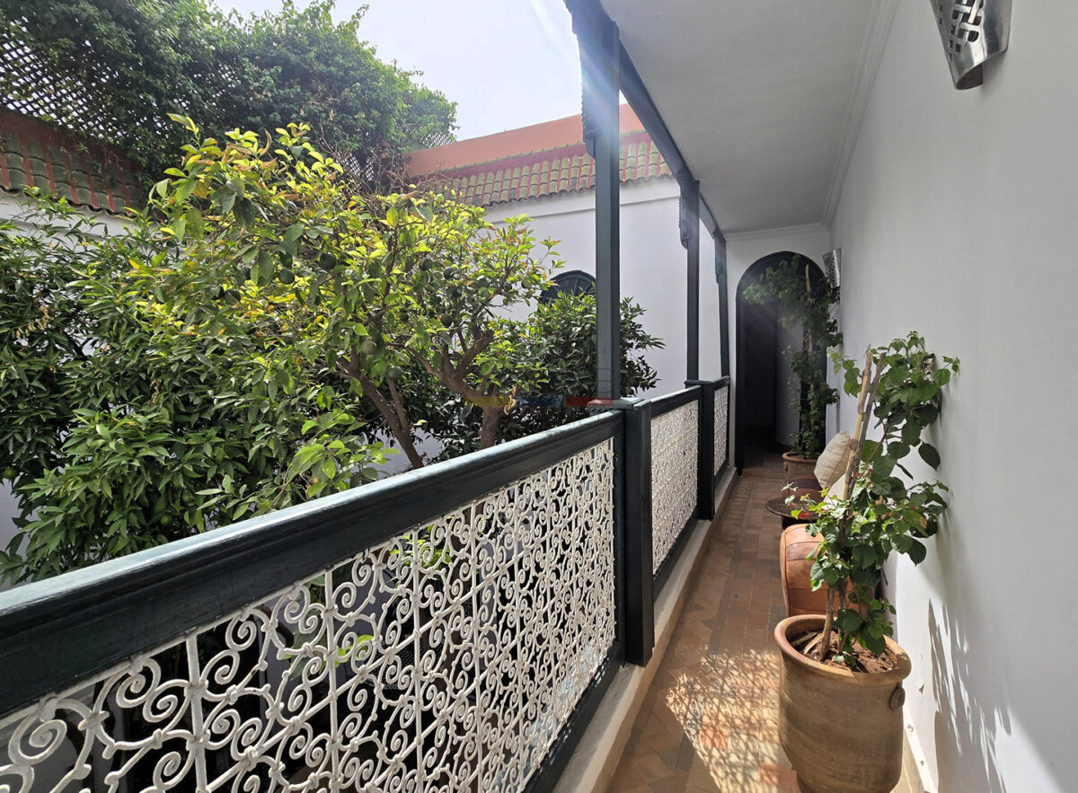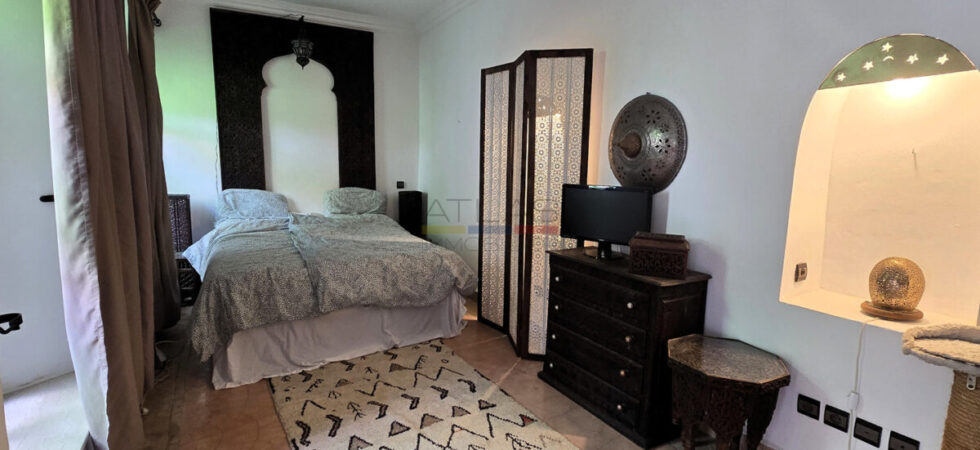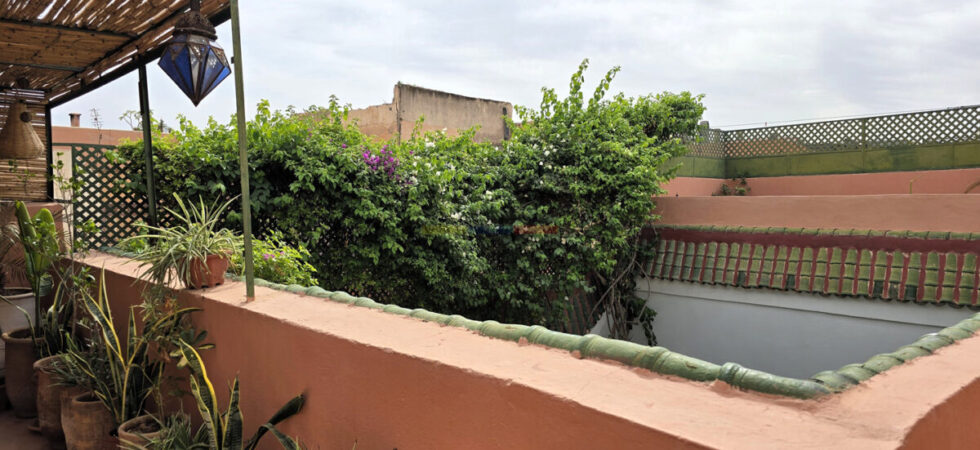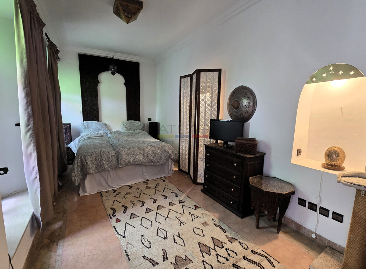 La terrasse, accessible par l’escalier intérieur, propose un agréable coin abrité idéal pour les repas en plein air, ainsi qu’un espace « solarium » invitant à la détente. L’ensemble forme un lieu de vie paisible, baigné de lumière, parfait pour une résidence principale, secondaire ou un investissement locatif dans l’un des secteurs les plus recherchés de Marrakech.