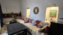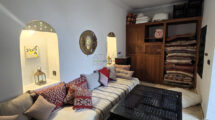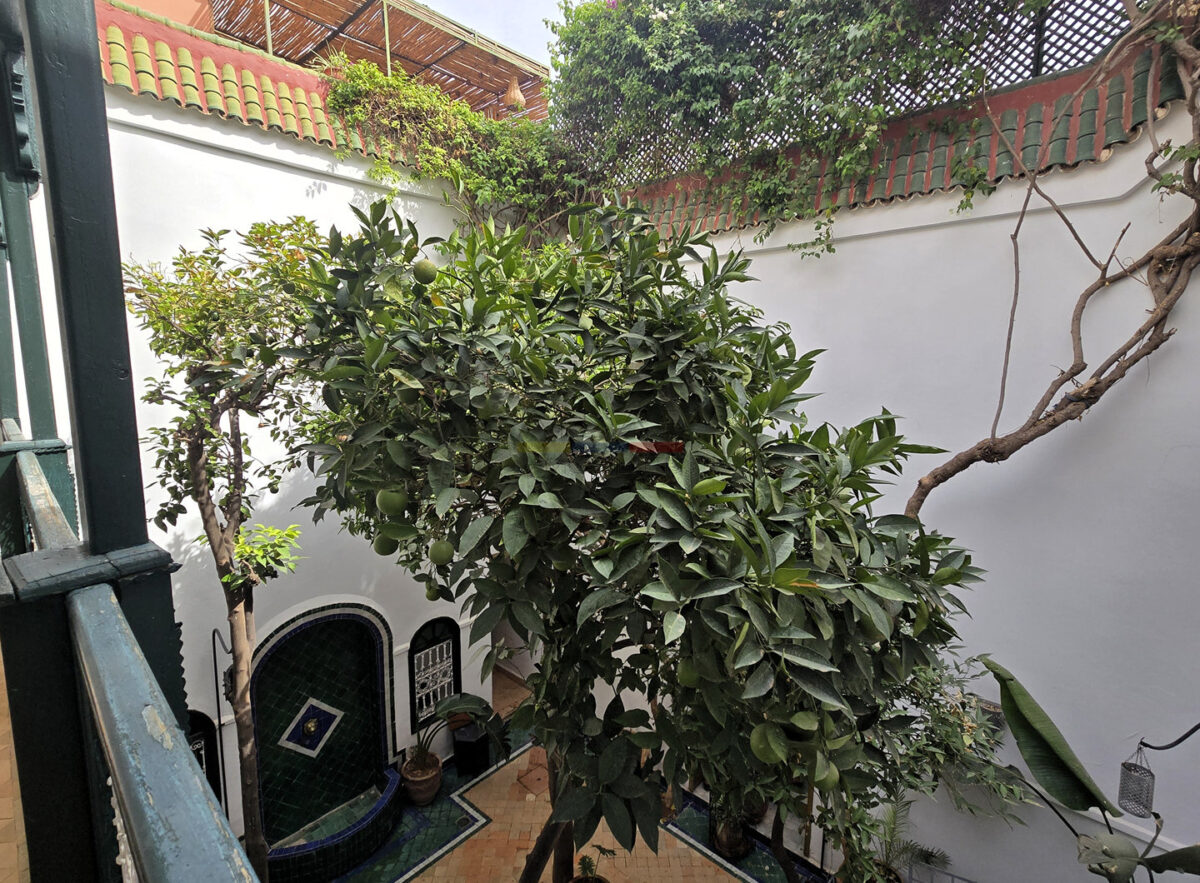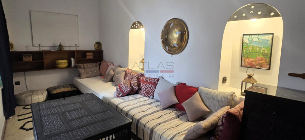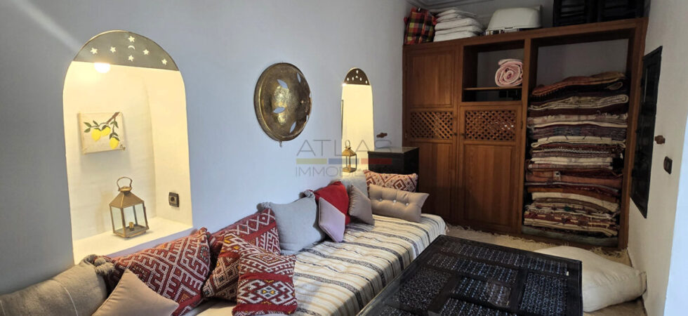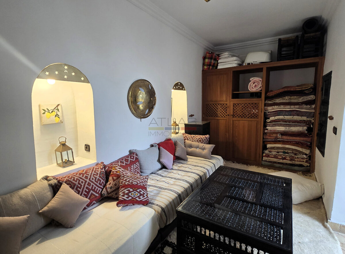 Ce riad en très bon état, d’une surface d’environ 89 m², offre une distribution harmonieuse et fonctionnelle. Au rez-de-chaussée, une entrée mène vers un patio lumineux d’environ 35 m², orné d’orangers et d’une bougainvillée, qui constitue le cœur vivant de la maison. On y trouve également une petite cuisine, des toilettes et un salon pouvant faire office de chambre. À l’étage, une chambre confortable et une salle de bains complètent l’espace nuit.