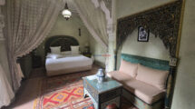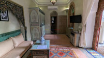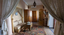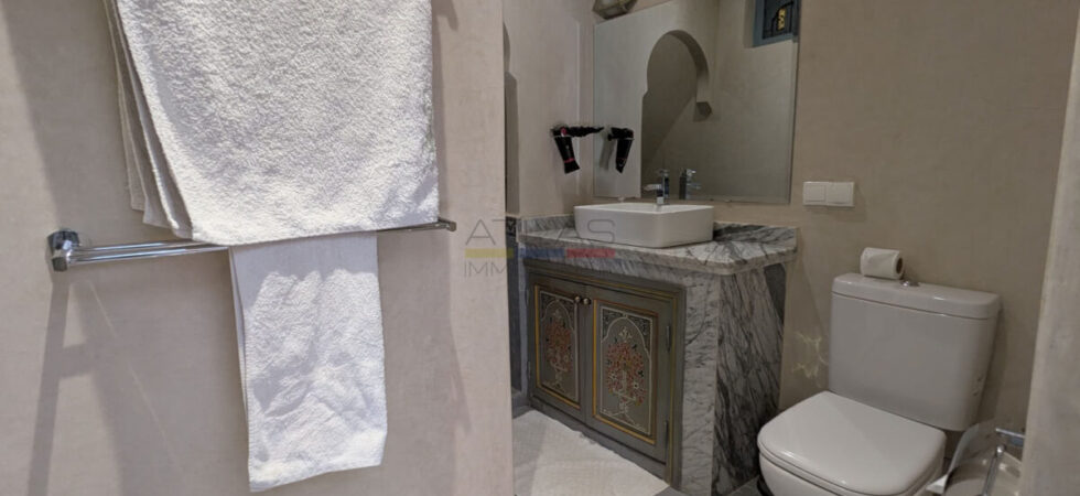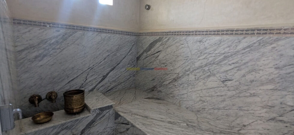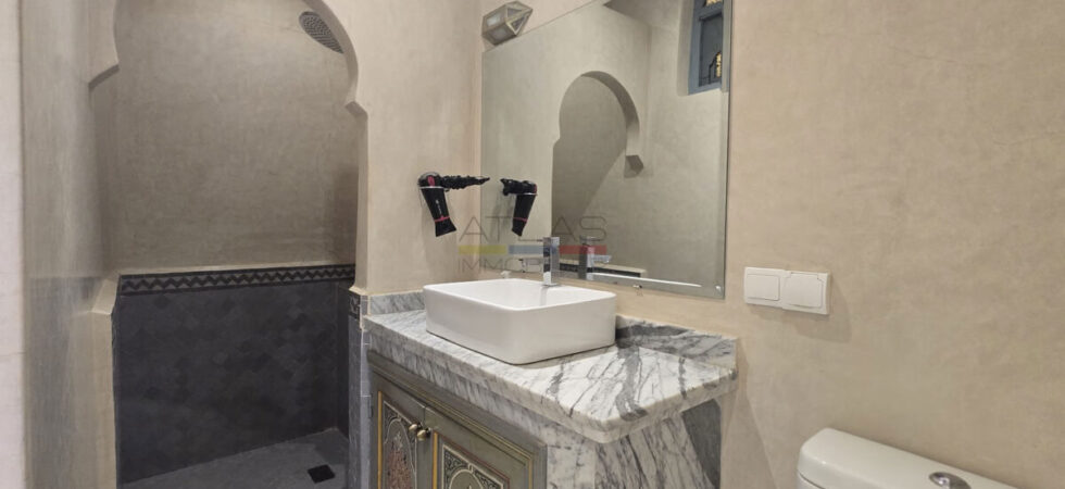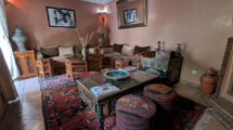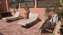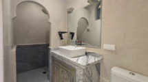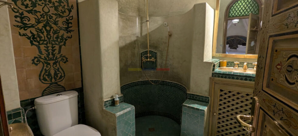 Le second riad, tout aussi raffiné, dispose d’un patio à fontaine murale, d’un salon ouvert et d’une chambre en rez-de-chaussée, complétés à l’étage par trois chambres avec salles d’eau privatives. Sur la terrasse, une buanderie et un hammam beldi complètent cet espace pensé pour le confort et la détente.