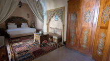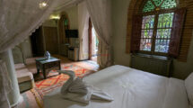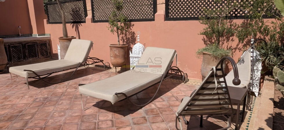 Le premier riad comprend une réception élégante, un salon avec cheminée, une suite au rez-de-chaussée et trois chambres à l’étage, toutes équipées de télévision, coffre et climatisation réversible. La terrasse supérieure propose un coin pergola, une cuisine d’été aménagée, des espaces repas, un local technique et un large solarium.