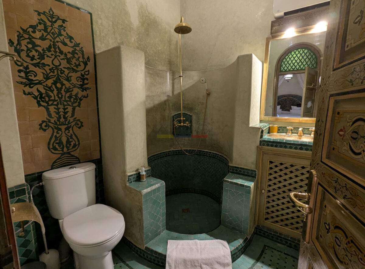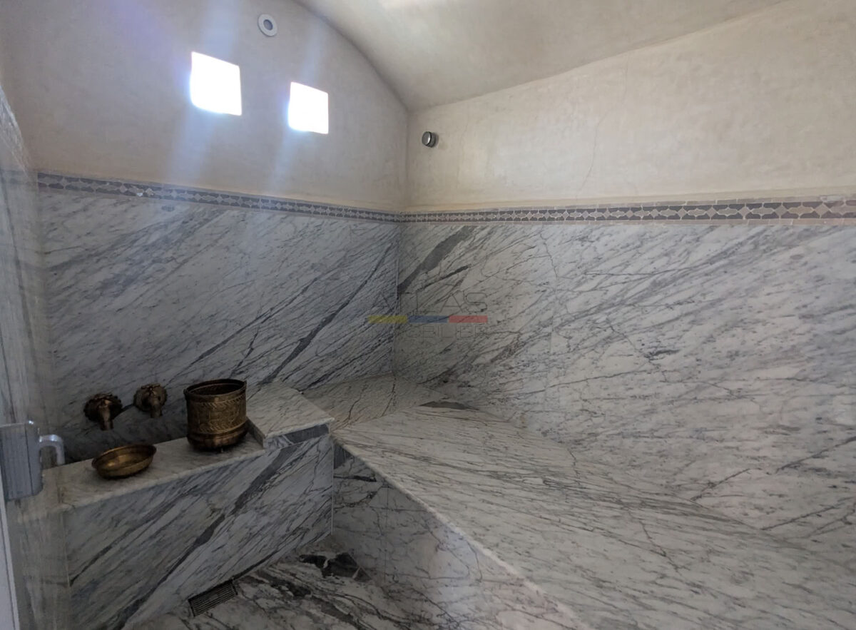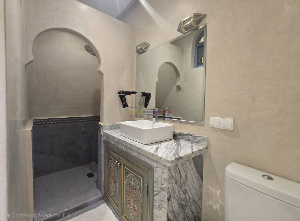 Le second riad, tout aussi raffiné, dispose d’un patio à fontaine murale, d’un salon ouvert et d’une chambre en rez-de-chaussée, complétés à l’étage par trois chambres avec salles d’eau privatives. Sur la terrasse, une buanderie et un hammam beldi complètent cet espace pensé pour le confort et la détente.