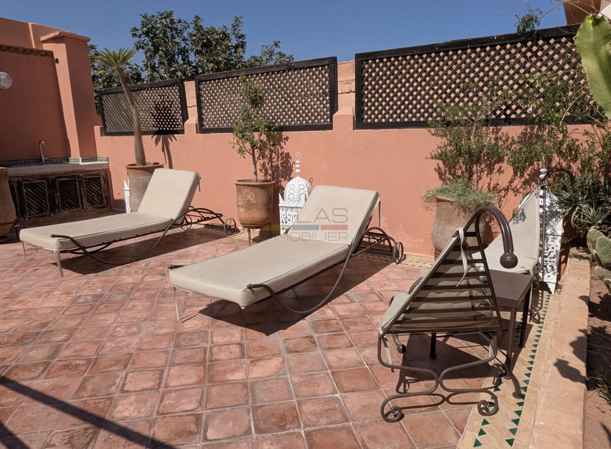 Le premier riad comprend une réception élégante, un salon avec cheminée, une suite au rez-de-chaussée et trois chambres à l’étage, toutes équipées de télévision, coffre et climatisation réversible. La terrasse supérieure propose un coin pergola, une cuisine d’été aménagée, des espaces repas, un local technique et un large solarium.