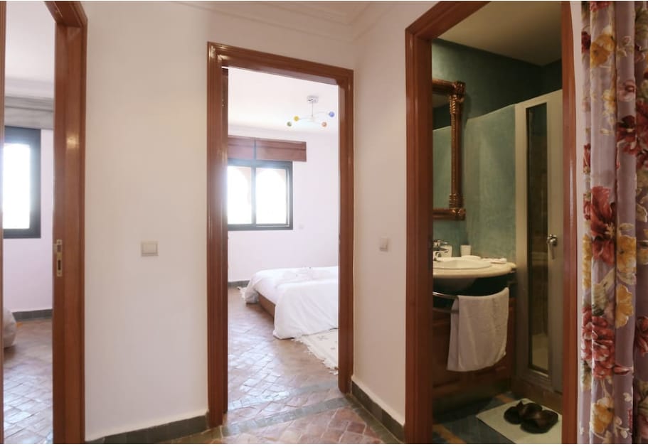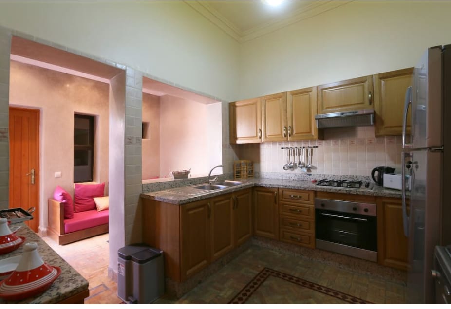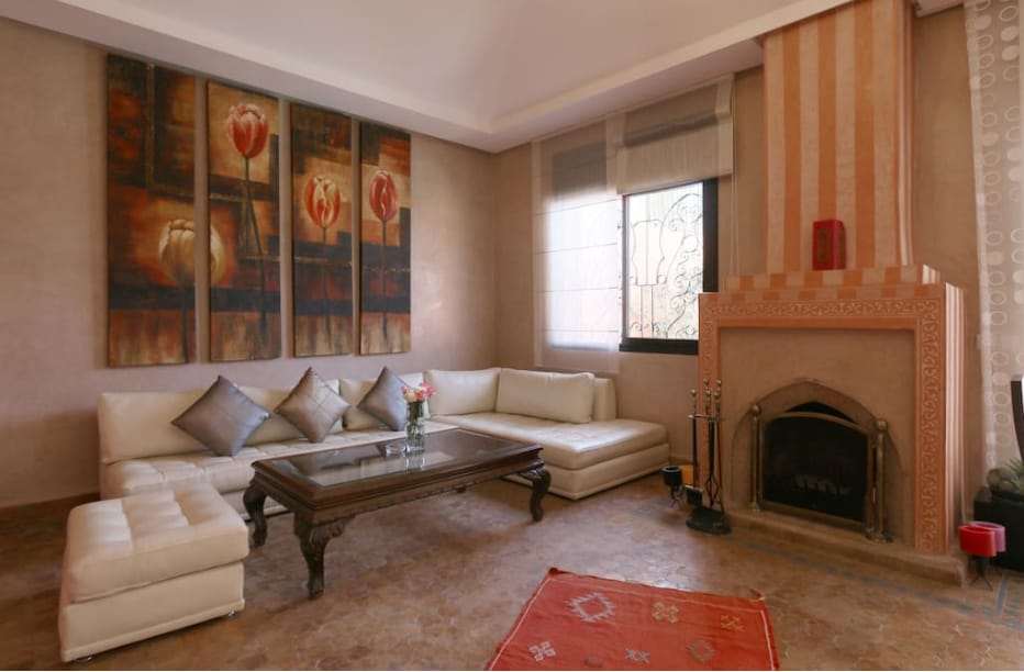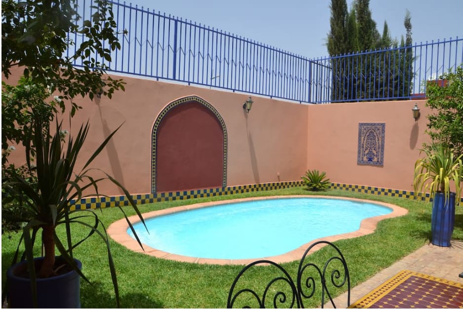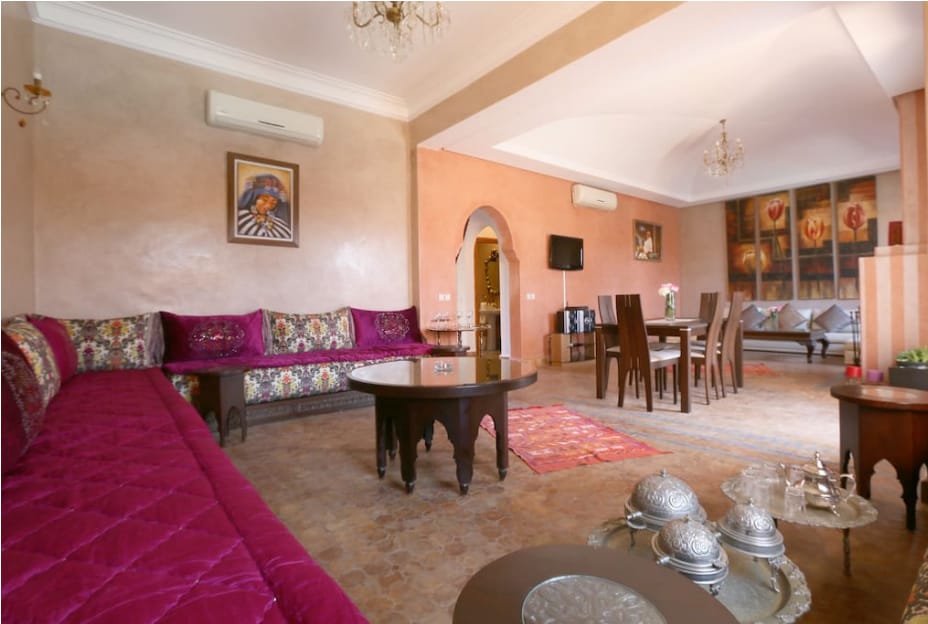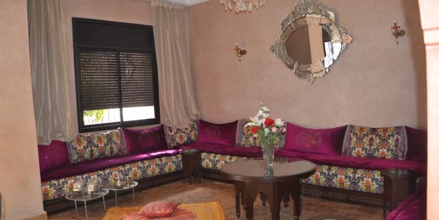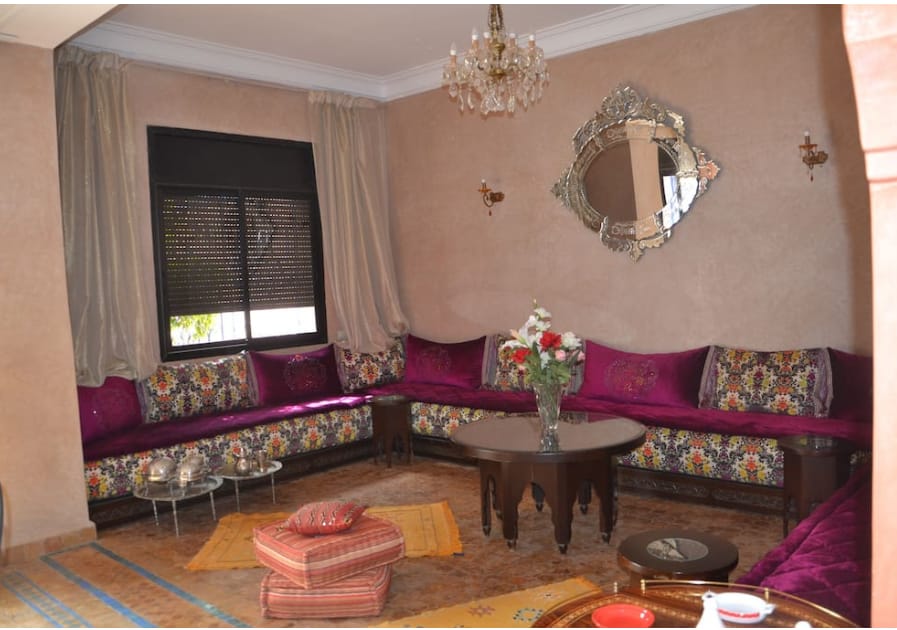 - Rez-de-chaussée ; Un grand salon marocain, une salle à manger et un salon type européen, cuisine bien équipée (micro-onde, cuisinière, four, machine à laver, lave-vaisselle), une chambre à coucher, une buanderie, deux salles d’eau, jardin avec piscine.