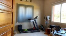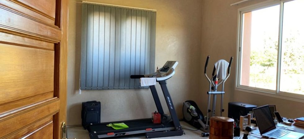 baignoire et meuble double vasque), un bureau avec équipement de fitness, une