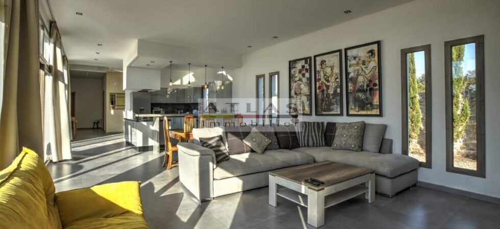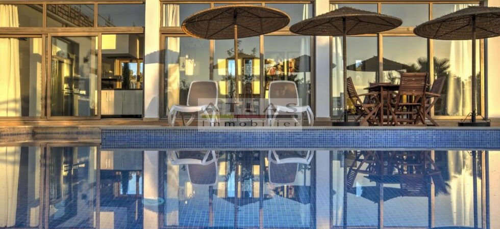 La villa se compose de 4 chambres spacieuses, chacune avec sa salle de bain privative, dont une suite parentale, assurant confort et intimité. La cuisine américaine, entièrement équipée, est ouverte sur un vaste salon baigné de lumière naturelle grâce à de grandes baies vitrées donnant sur l’extérieur. Les espaces extérieurs, magnifiquement aménagés, comprennent une grande piscine, des terrasses et des salons extérieurs idéaux pour des repas en plein air. Depuis la terrasse supérieure, profitez d’une vue imprenable sur la mer et admirez le lever et coucher du soleil.