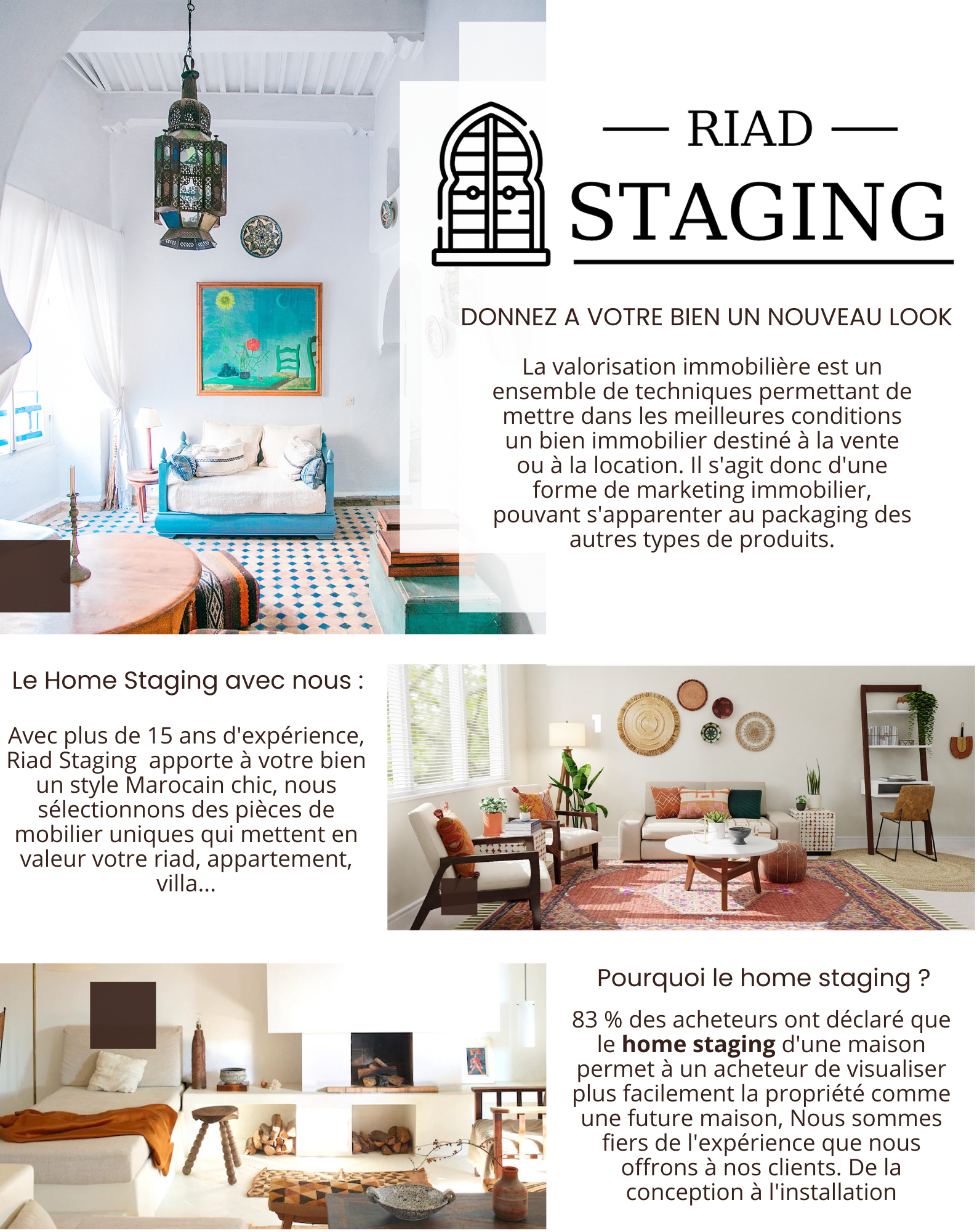 Riad Staging vise à mettre en valeur votre bien afin qu’il soit vendu ou loué plus rapidement ou à un meilleur prix. Il vise à rendre une propriété attrayante pour le plus grand nombre d’acheteurs potentiels, et de les aider à s’imaginer vivre dans celle-ci, d’adopter un style de vie contemporain.